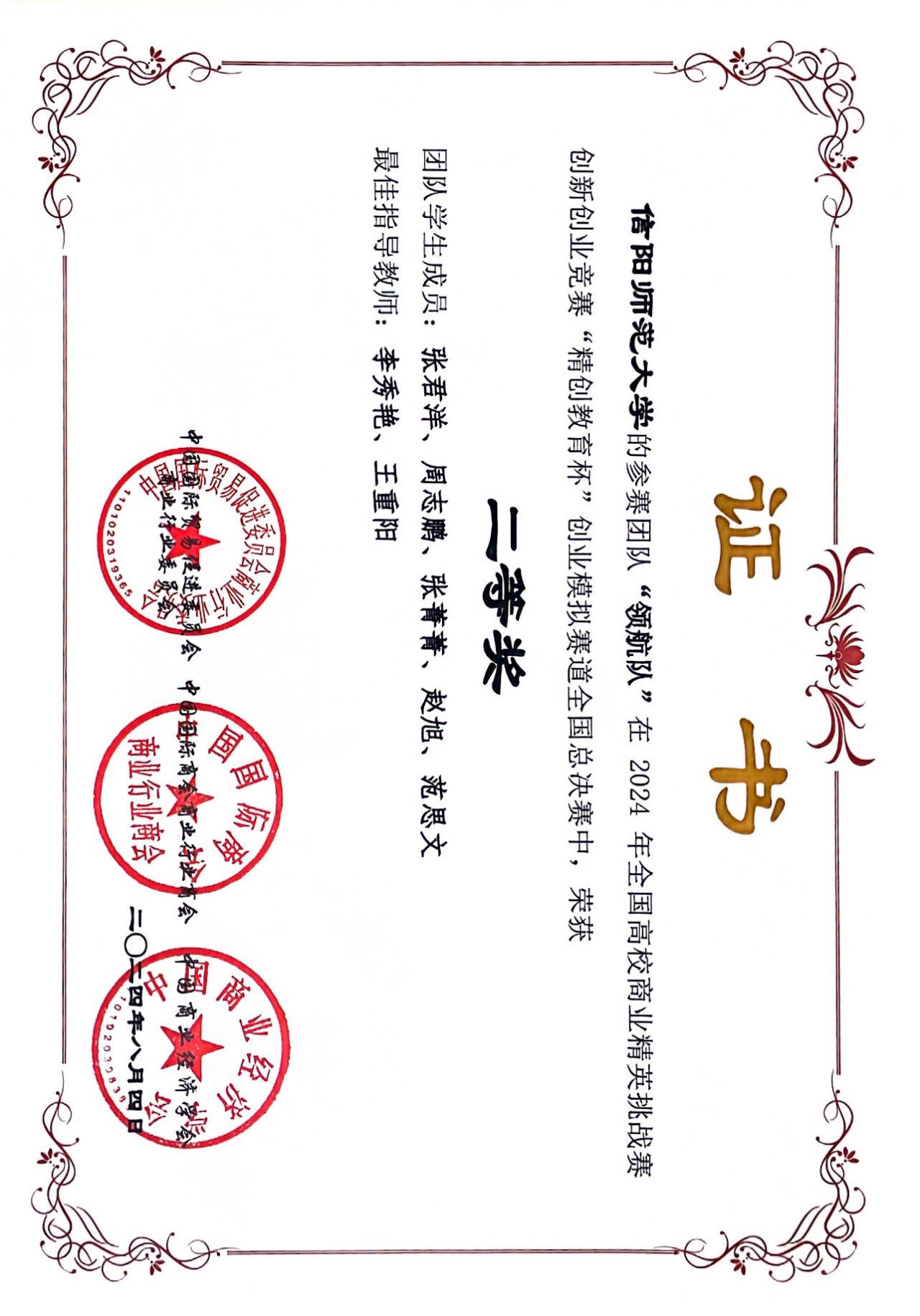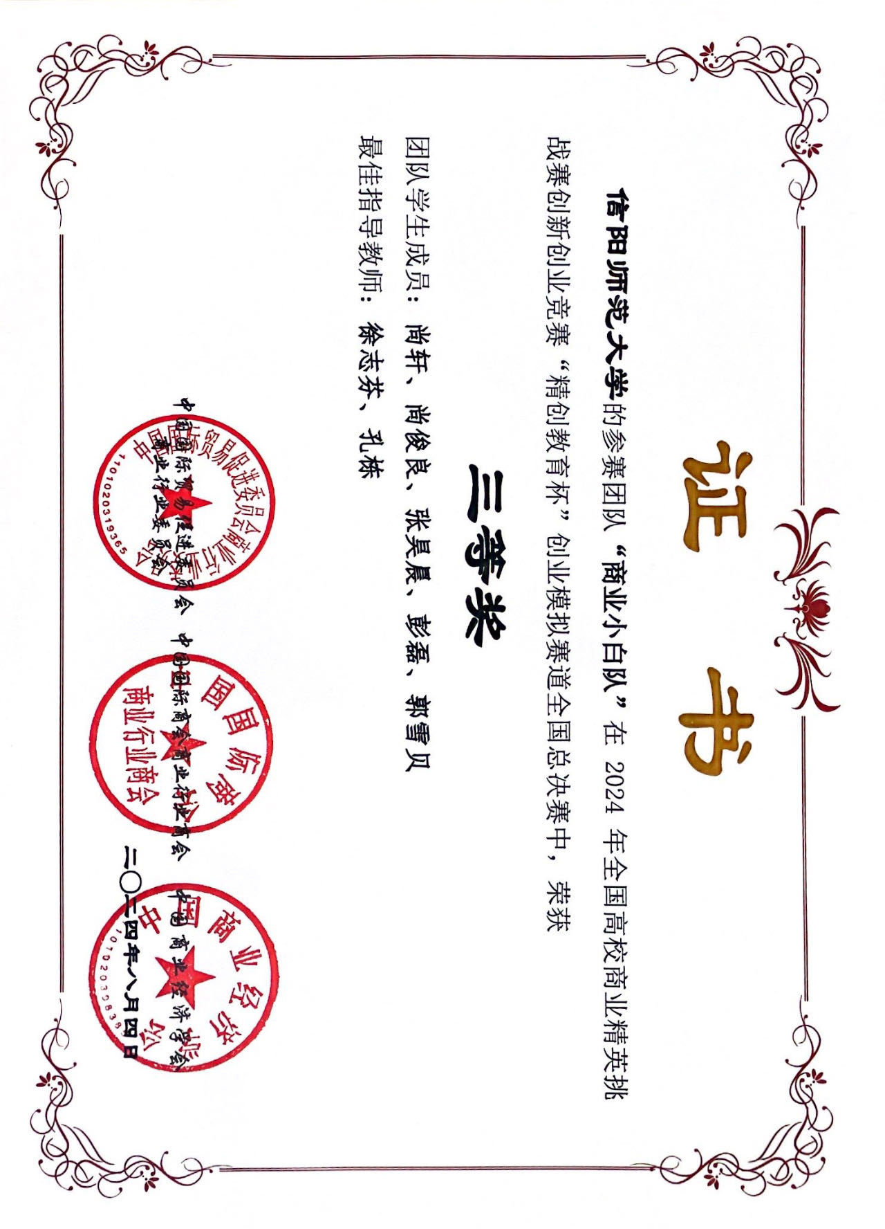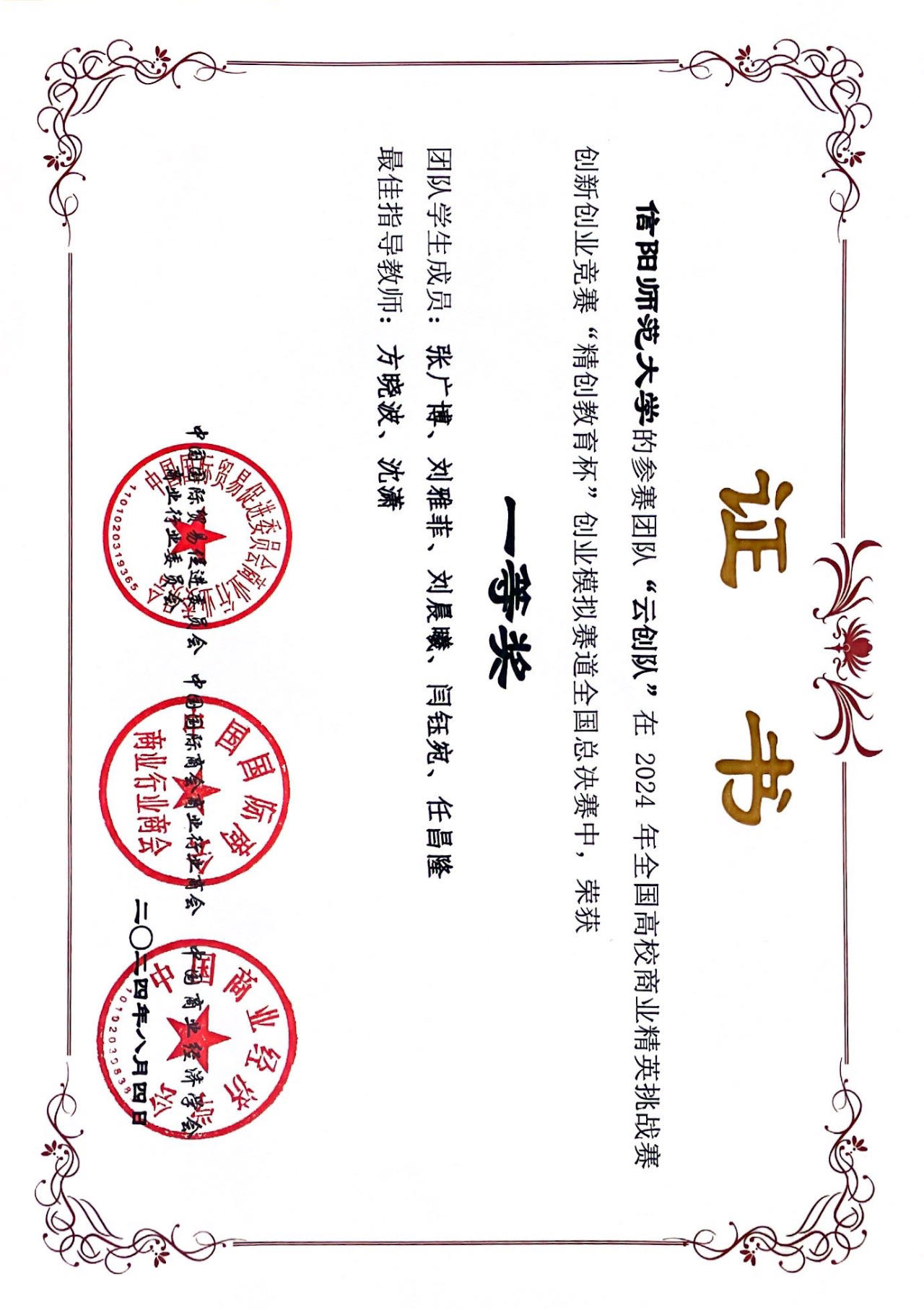 近日,在2024 年全国高校商业精英挑战赛创新创业竞赛“精创教育杯”创业模拟赛道全国总决赛中,bw西汉姆联参赛的3支团队分别荣获全国总决赛一等奖、二等奖和三等奖,方晓波、沈潇、李秀艳、王重阳、徐志芬、孔栋获最佳指导教师称号。