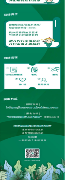 广阔天地,大有可为!中国农业银行诚邀有抱负、有理想、有激情的青年人才,与我们一同成长,共创辉煌!欢迎奋战在新冠肺炎疫情防控一线的医护人员子女报考我行。