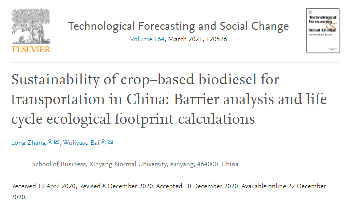 近日,公司bw西汉姆联张龙博士撰写的论文《Sustainability of crop–based biodiesel for transportation in China: Barrier analysis and life cycle ecological footprint calculations》在社会科学领域国际顶级学术期刊《Technological Forecasting and Social Change》上发表,公司为该论文的唯一完成单位。根据国际期刊引证报告,该期刊为SSCI一区(JCR分区),影响因子高达8.593,在区域与城市规划领域排名1/40,商业领域排名22/153。