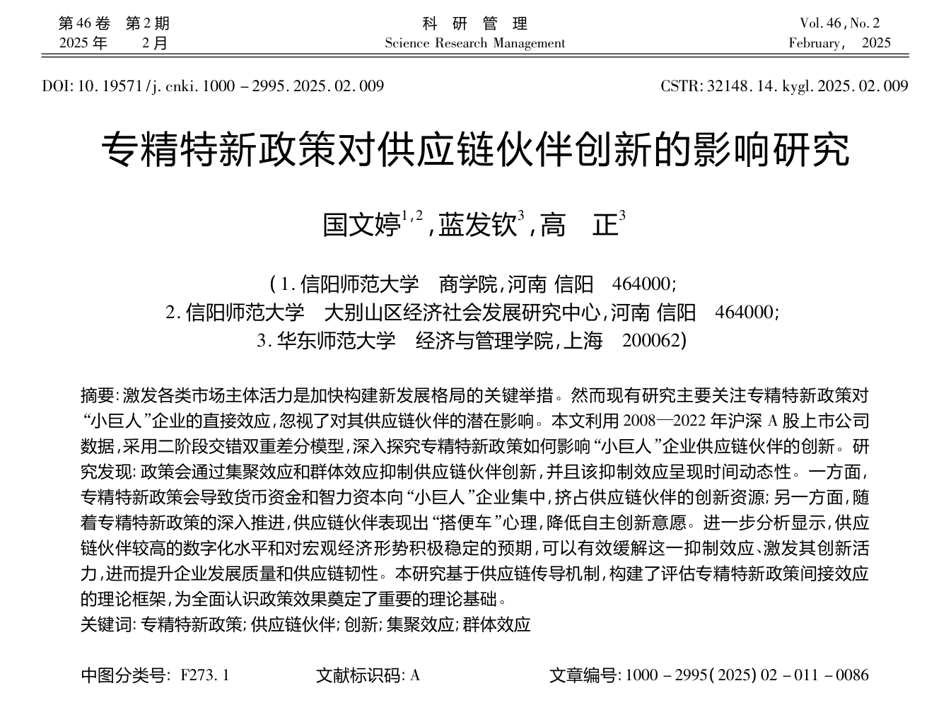 近日,bw西汉姆联国文婷博士在管理学权威期刊《科研管理》2025年第2期上发表题为“专精特新政策对供应链伙伴创新的影响研究”学术论文。《科研管理》为国家自然科学基金委员会管理科学部认定的管理科学A级重要期刊,被五大检索库(CSSCI,北大核心,JST,CSCD,AMI核心)同时收录,为公司认定的一级权威期刊。