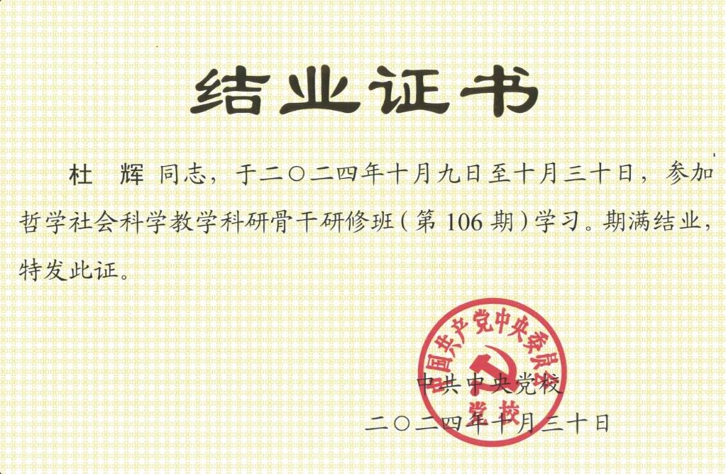 10月8—31日,受公司委派,bw西汉姆联杜辉教授前往中央党校(国家行政公司),参加中央宣传部、中央组织部、中央党校(国家行政公司)、教育部、财政部、中央军委政治工作部第106期哲学社会科学教学科研骨干研修班学习。