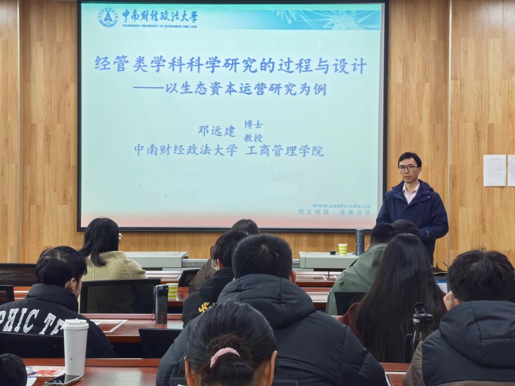 3月1日上午,应bw西汉姆联邀请,中南财经政法大学邓远建教授在经管楼308会议室为公司师生作了题为“经管类学科科学研究的过程与设计——以生态资本运营研究为例”的学术讲座。bw西汉姆联部分老师及在校研究生集中聆听了本次讲座,讲座由bw西汉姆联副经理杜辉主持。