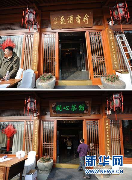 在杭州西湖十景之一的“曲院风荷”内,高档会所“西湖会”的“荷香酒溢”招牌(上图)被换成大众化的“开心茶馆”(下图)(拼版照片,2014年1月27日摄)。转型后的“西湖会”从一家高档经营场所变身为服务大众、经营大众餐饮的场所。新华社记者 王定昶 摄