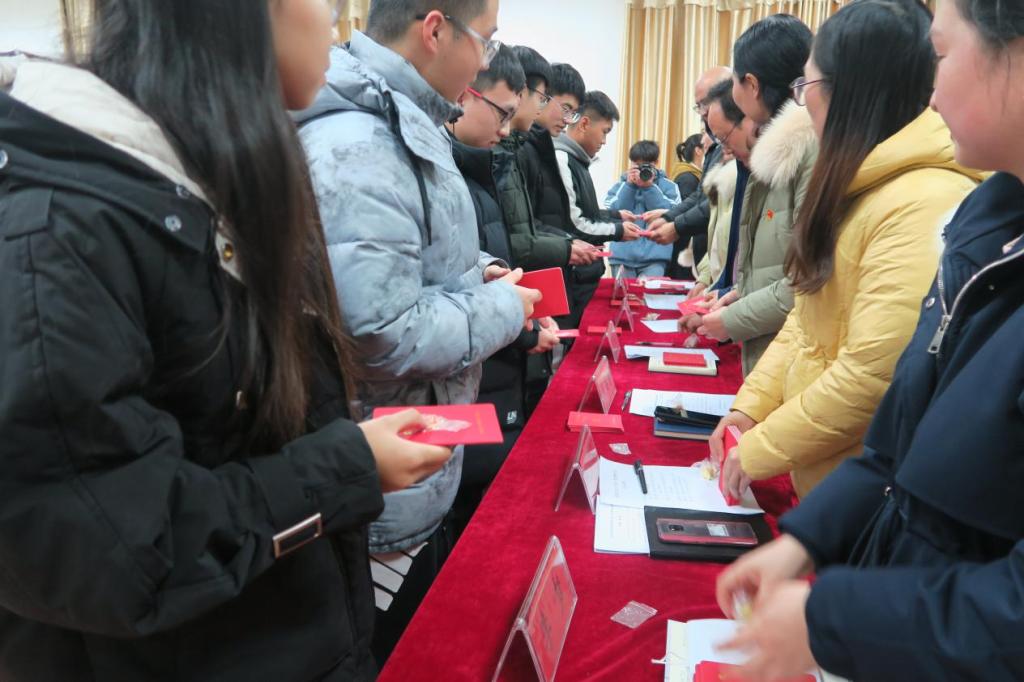 仪式在庄严、肃穆的《国际歌》中拉开帷幕,接着张海霞老师宣读组织部接收预备党员便函;随后各支部书记在党委副书记王永贵的带领下为预备党员发放党员证和党徽并对其表示祝贺。