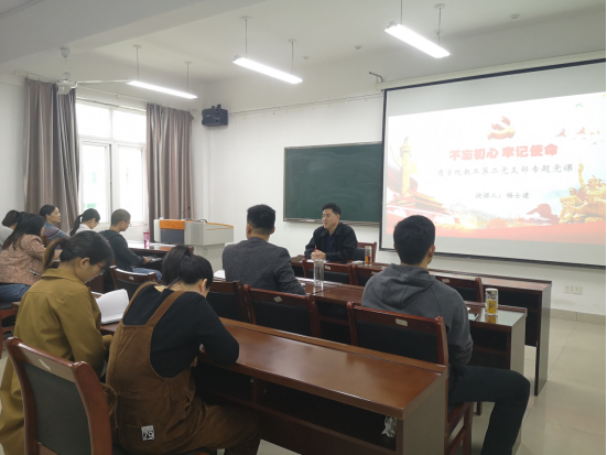 公司党委书记盛正国以“始终牢记党的初心使命,全面落实立德树人根本任务”为题,在经管楼310会议室为全体教工党员做了一场内容丰富的党课辅导报告。盛正国分别从初心和使命是中国共产党人的革命本色和根本动力,为党育人、为国育才是教育工作者的神圣使命,以及守土有责、久久为公,全面落实立德树人根本任务三个方面深入浅出的阐述了党员同志应如何守初心、担使命。他讲到,作为一名共产党员,应从坚持政治统领、加强理论武装、注重价值引领、做好言传身教等方面严格要求自己。