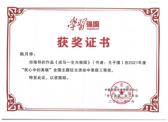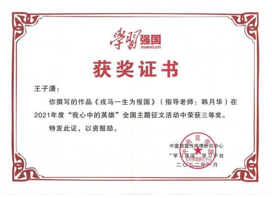 近日,由中宣部“学习强国”学习平台发起的“我心中的英雄”全国主题征文活动评选结果揭晓,bw西汉姆联员工王子潇撰写的《戎马一生为报国》(指导教师韩月华)脱颖而出,荣获三等奖。