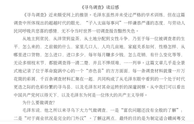 《寻乌调查》是毛泽东主席在土地革命的关键时期所作的重要调研,其内容包括地理位置、历史沿革、行政区划、自然风貌、水陆交通、土特产品、商业往来、商品种类、货物流向、税收制度、人口成份、土地关系、阶级状况、剥削方式、土地斗争等等,全文共分为五章39节,超过八万字。